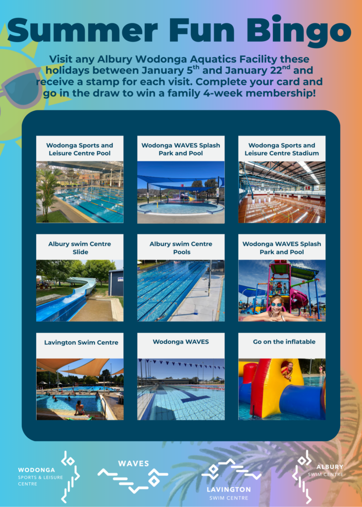 Visit any Albury Wodonga Aquatics Facility these holidays between 5th - 22nd January and collect your bingo card.